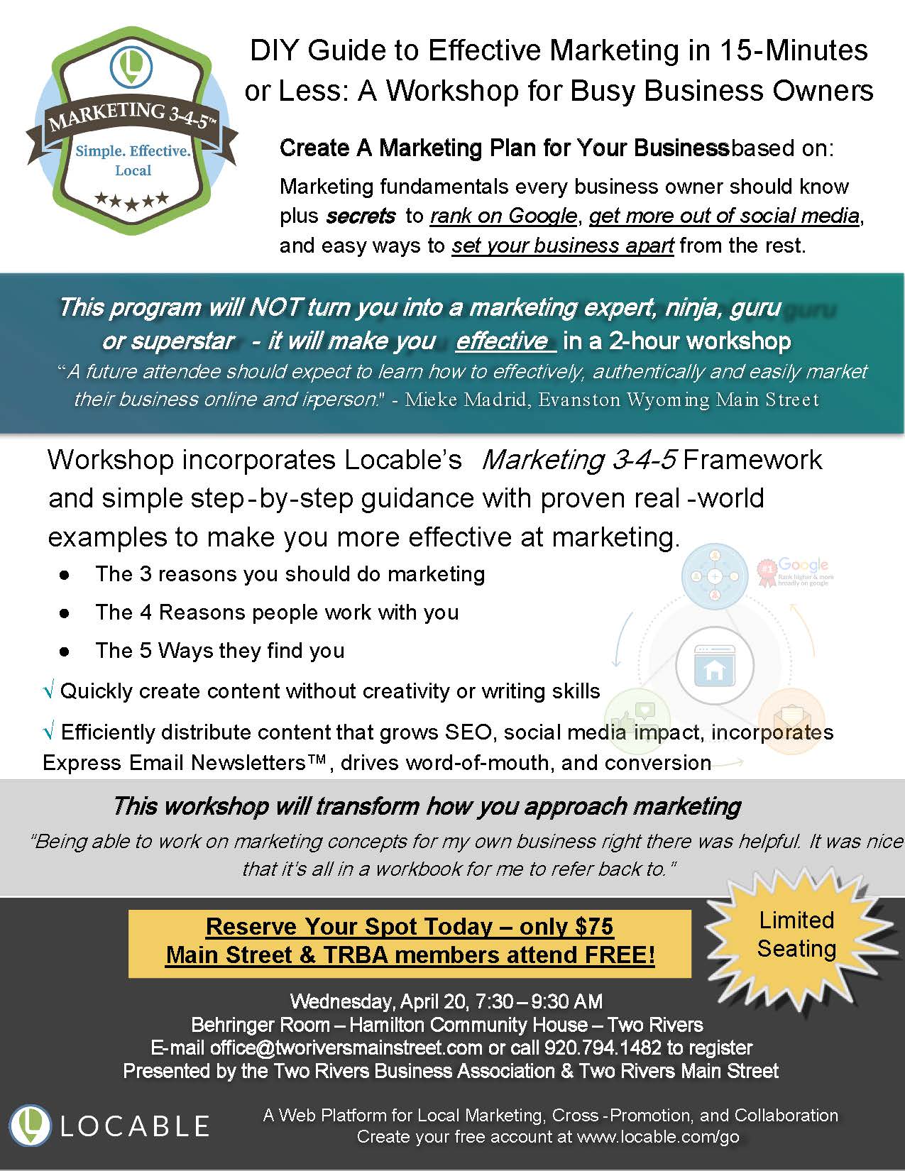 - Join us in Two Rivers to learn a simple, no-nonsense approach to marketing and growing your business. Brian Ostrosky of Locable will teach you marketing fundamentals every business owner should know. The cost is only $75 per person. However, if your business is a Two Rivers Main Street member or a Two Rivers Business Association member…your attendance is free! Email us at office@tworiversmainstreet.com or call 920.794.1482 to register. Space is limited, so sign up today!