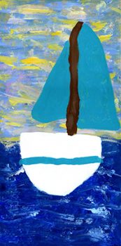 Matthew is four and a half years old. He loves to paint! Some of his favorite paintings are of animals (his pets) and trains. Several of his paintings are displayed in our home. Matthew chose finger painting, brushes, bubble wrap, cotton balls and yarn to make his sailboat painting. He chose a sailbaot because it reminded him of the “ocean in Two Rivers.”