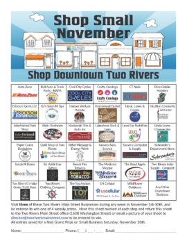 Pick up a Shop Small November Sheet at participating businesses. Then shop at three other Main Street businesses and return your sheet to the Main Street Office (1608 Washington Street) or email (Director@tworiversmainstreet.com) a photo to the office to be eligible for weekly prizes.